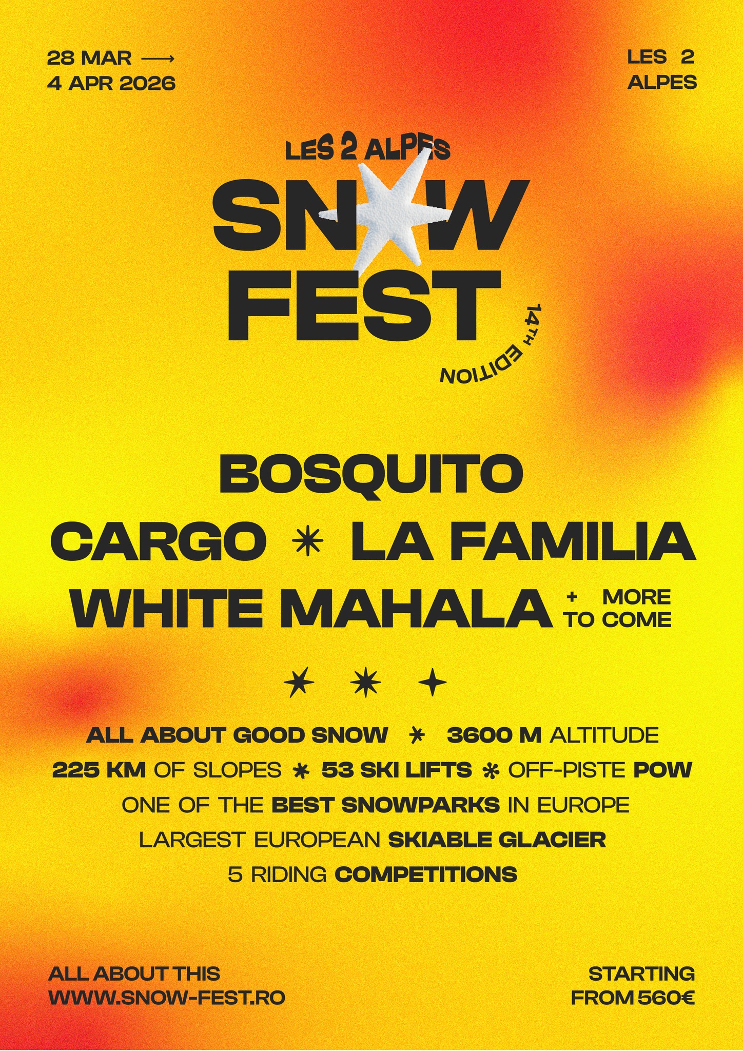 Încă din anul 2011 am făcut o tradiție din a aduna mii de români în inima Alpilor francezi, unde ne bucurăm împreună de cele mai îndrăgite trupe românești și DJ-i autohtoni. Îmbinăm sporturile de iarnă cu distracția, concertele live și petrecerile de neuitat. Snow Fest e mai mult decât un festival – e o experiență unică, o aventură românească la altitudine!