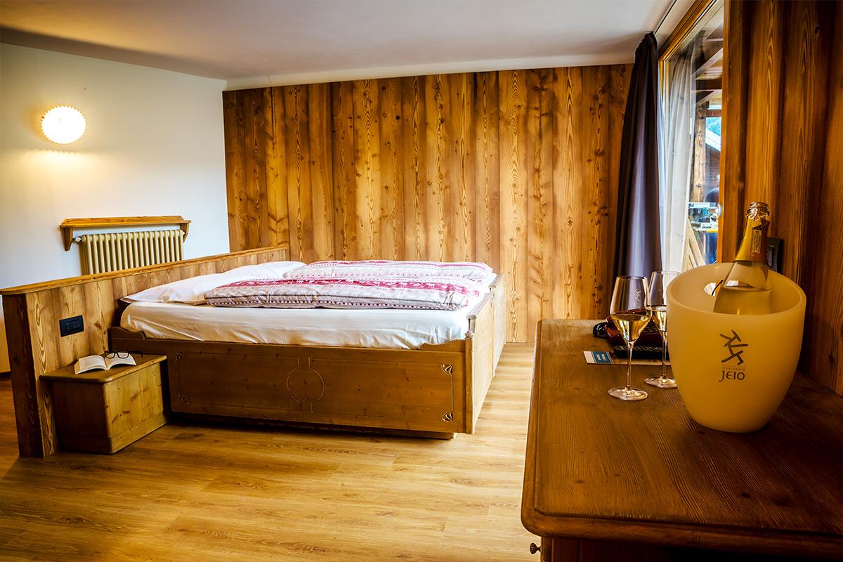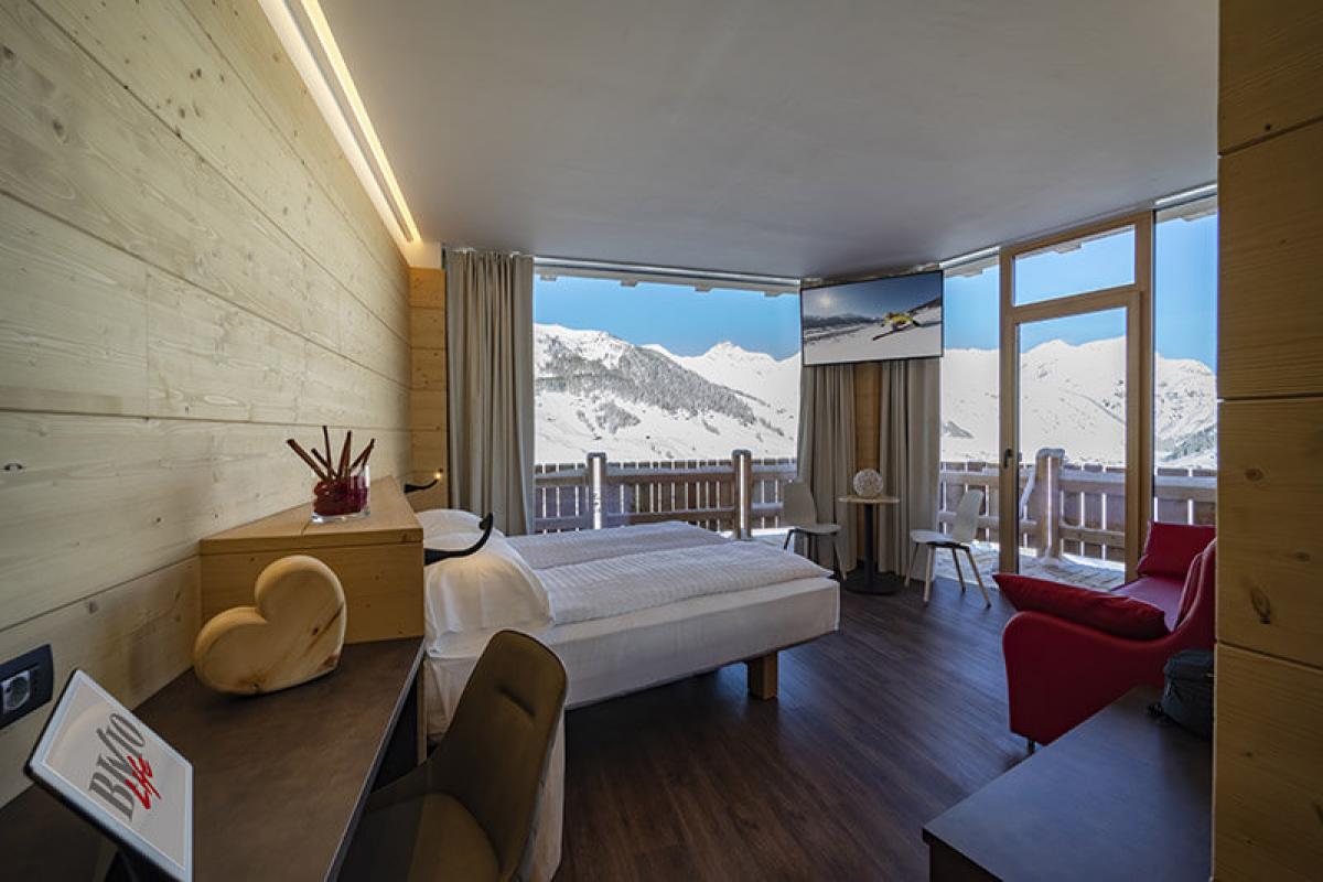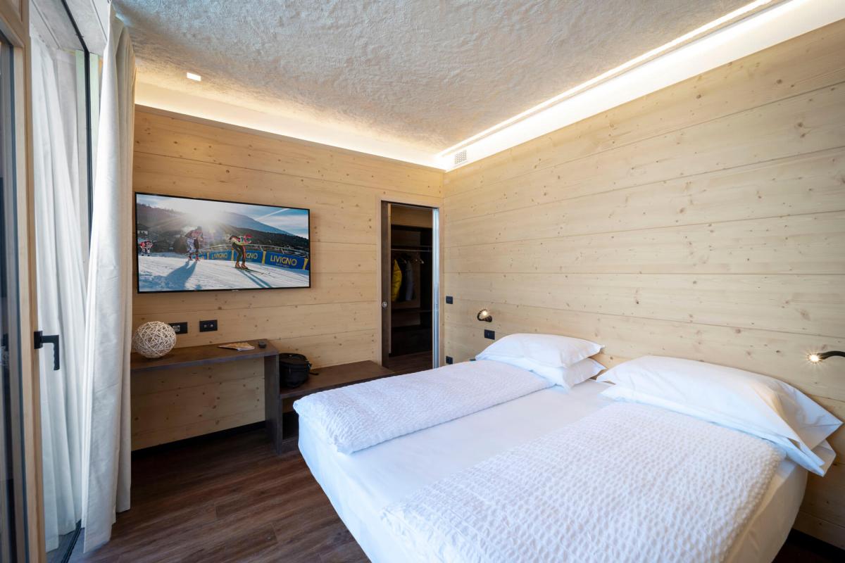 Luxury Spa Suite: Suita este formată din parter și mezanină, aproximativ 60/65m². Design modern, mobilier din lemn de pin provenit din pădurile din Livigno. Geamuri mari cu priveliște panoramică asupra văii. Baie cu duș, WC, chiuvetă, duș open space. Cameră dotată cu minibar, seif, TV LCD, halat de baie, papuci. La parter dormitor cu pat dublu și baia, la mezanină o canapea extensibilă potrivită pentru o persoană. Există o saună cu infraroșu și baie turcească cu priveliște panoramică.