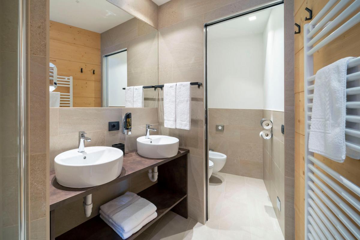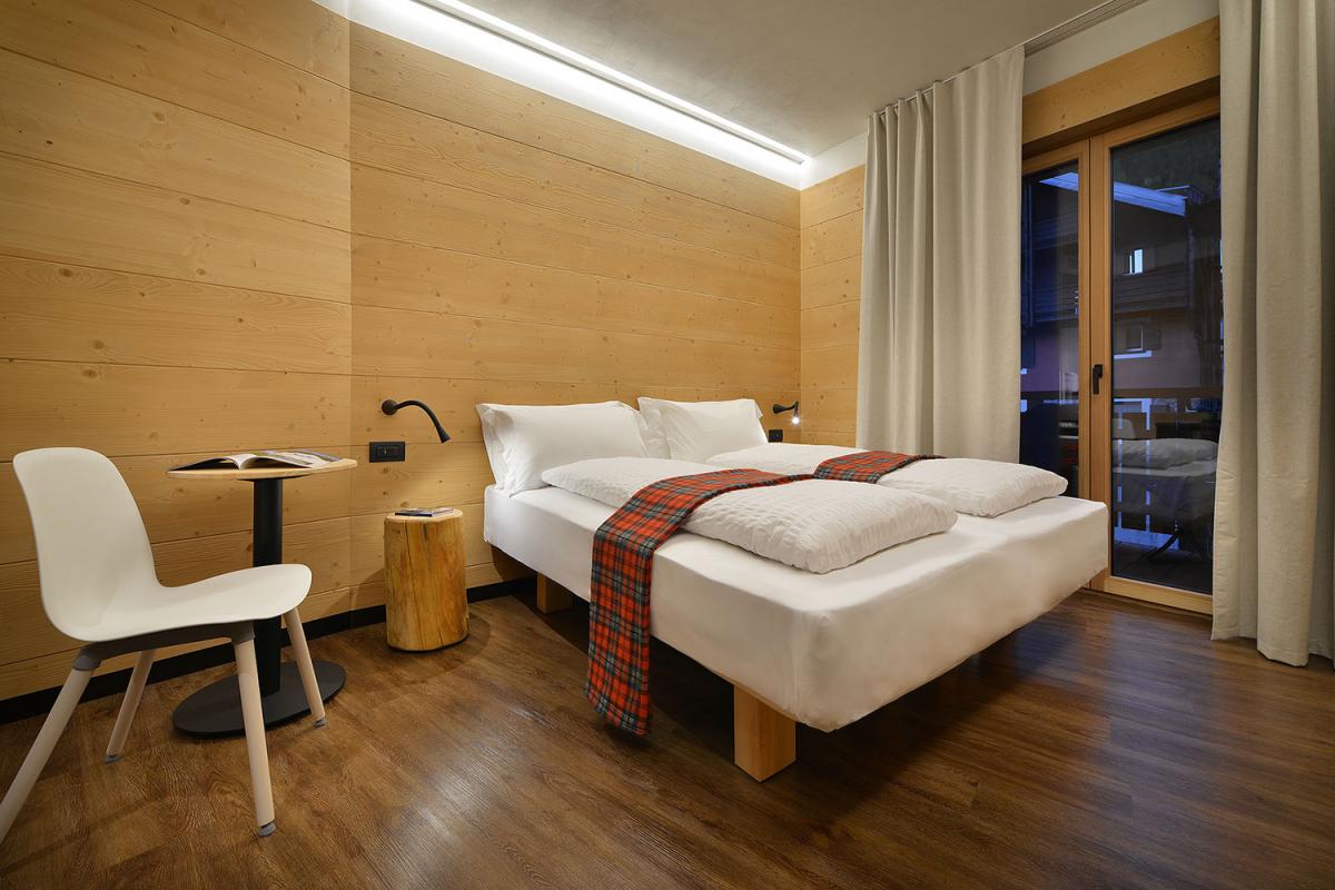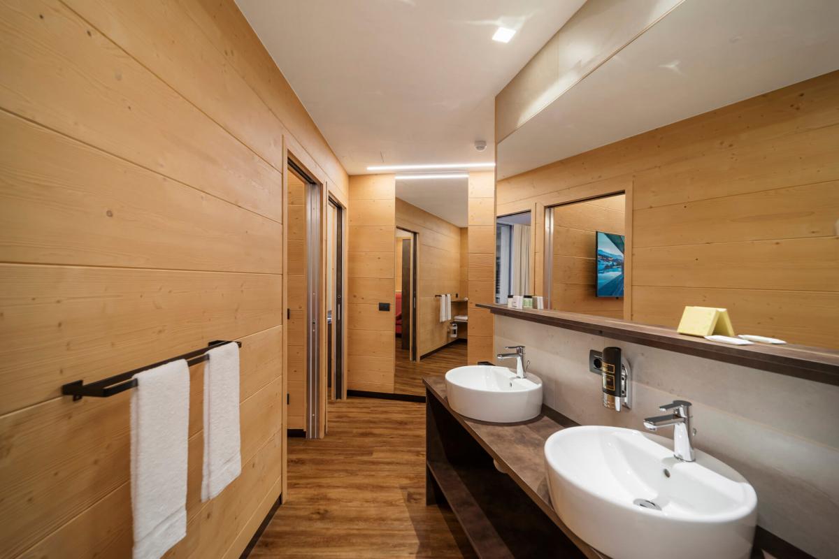 • Cameră Nord Family Suite: 36m2, cu balcon, vedere către gradină, este compusă dintr-o cameră cu un pat dublu și dintr-un living cu o canapea extensibilă pentru 2 persoane + o canapea pentru o persoană. Design modern alpin, cu podea din lemn provenit din pădurile din regiune, baie spațioasă dotată cu duș open space, minibar, TV LCD 42. (capacitate maximă 5 persoane, cel mult 3 adulți)
