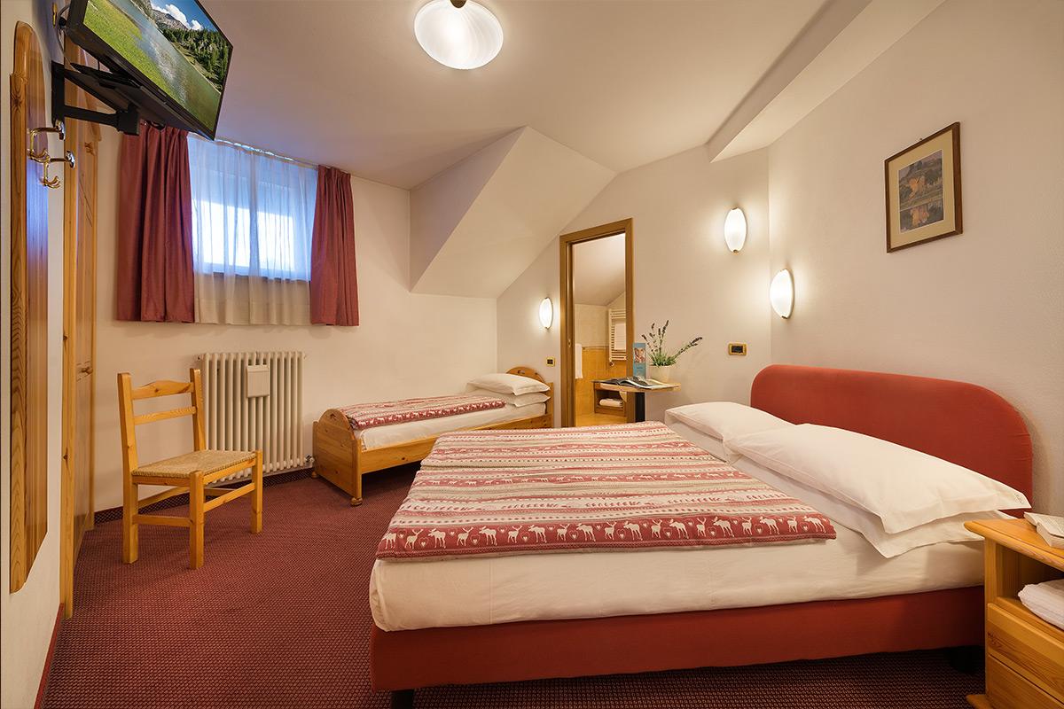 Roof Family Suite / New attic Suite: Suita este formată din parter și mezanină, aprox 30/32m². Design modern, mobilier din lemn de pin ce provine din pădurile din Livigno, geamuri largi (fără vedere panoramică asupra văii). Baie cu duș, wc, chiuvetă, dușul este open space. Camera este dotată cu minibar, seif, TV LCD, halat de baie, papuci. La parter se află dormitorul cu pat dublu și baia, la etaj mai sunt disponibile 2 paturi suplimentare.